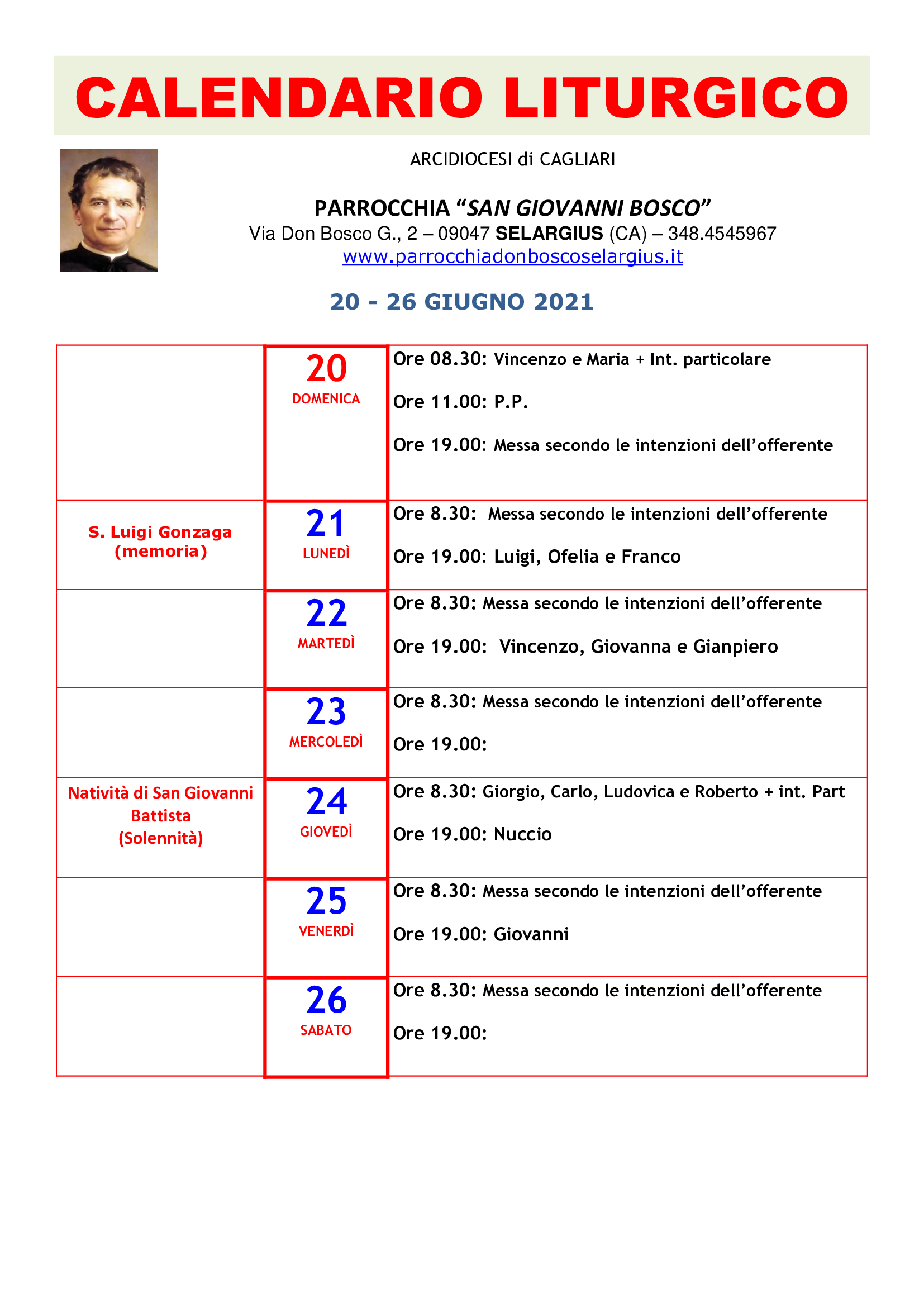 Calendario liturgico parrocchiale XII domenica del tempo ordinario Pubblicato giorno 21 giugno 2021 - In home page