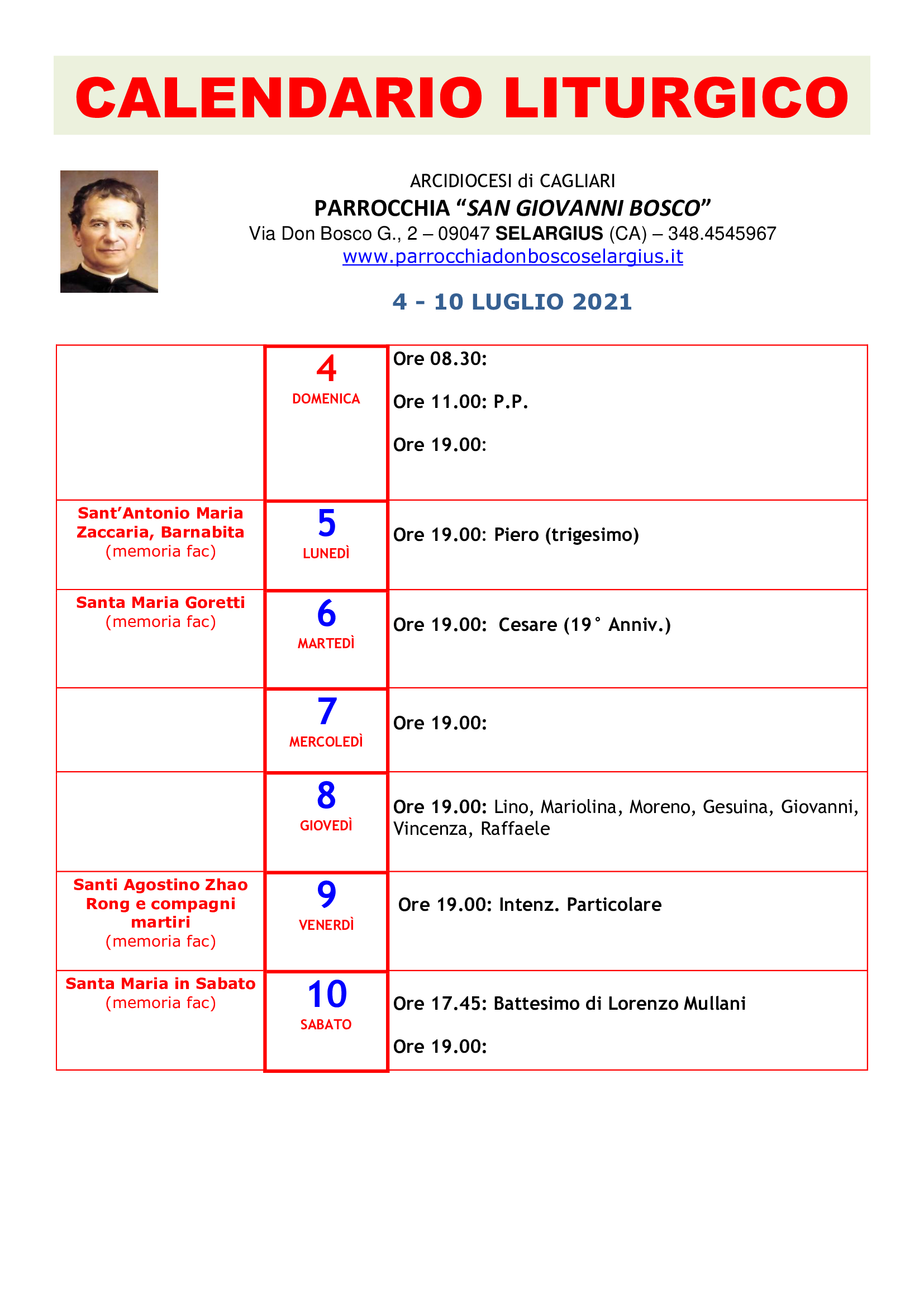 Calendario liturgico parrocchiale XIV domenica del tempo ordinario Pubblicato giorno 4 luglio 2021 - In home page
