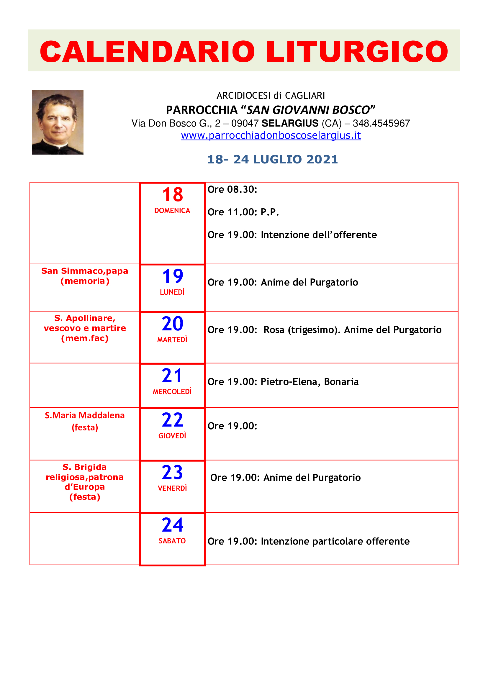 Calendario liturgico parrocchiale XVI domenica del tempo ordinario Pubblicato giorno 18 luglio 2021 - In home page