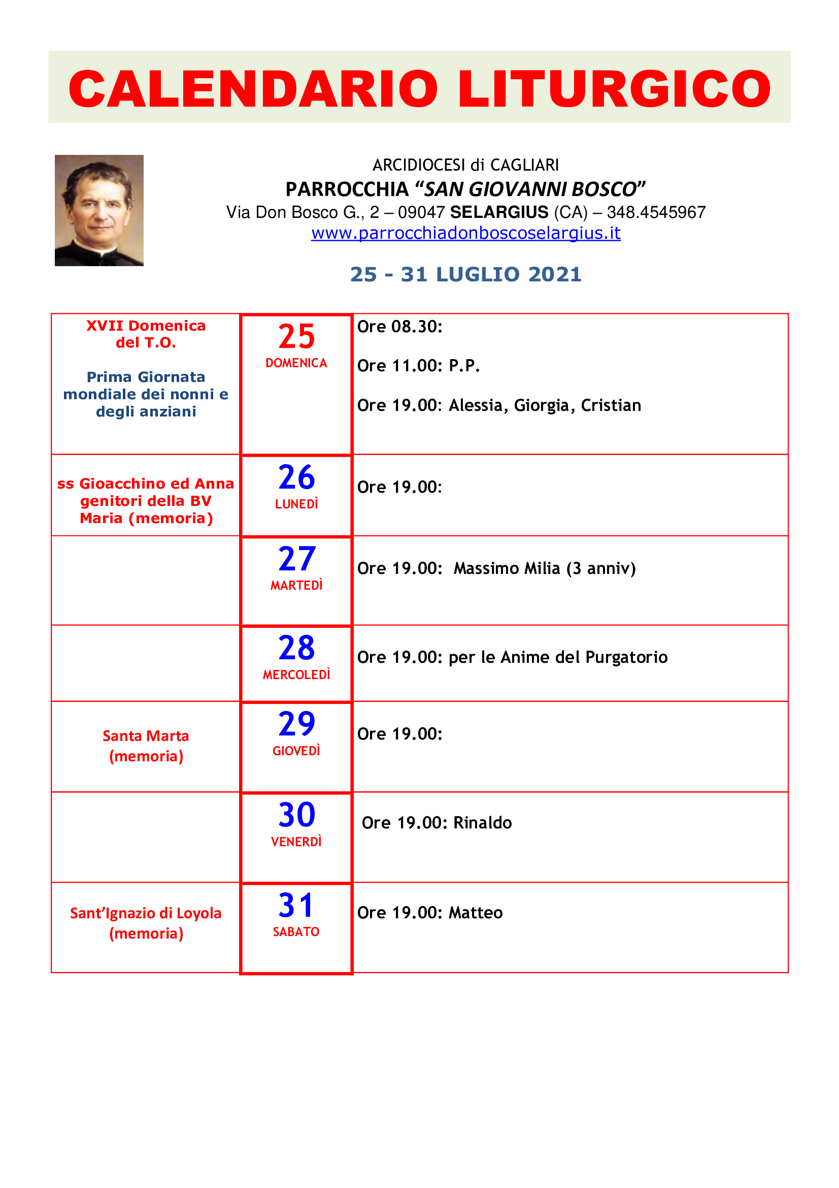 Calendario liturgico parrocchiale XVII domenica del tempo ordinario Pubblicato giorno 24 luglio 2021 - In home page