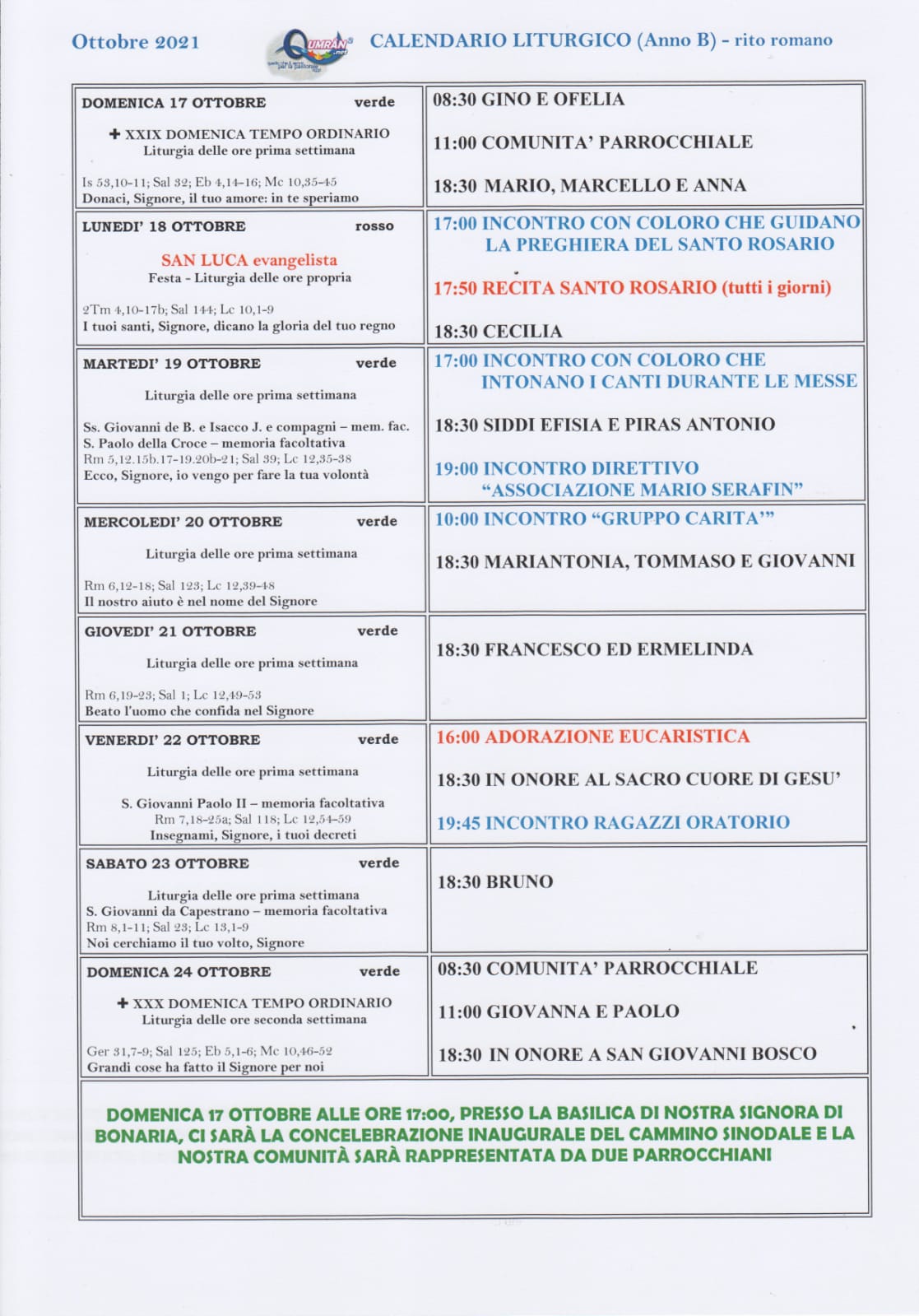 Calendario liturgico parrocchiale XXIX domenica del tempo ordinario Pubblicato giorno 16 ottobre 2021 - In home page