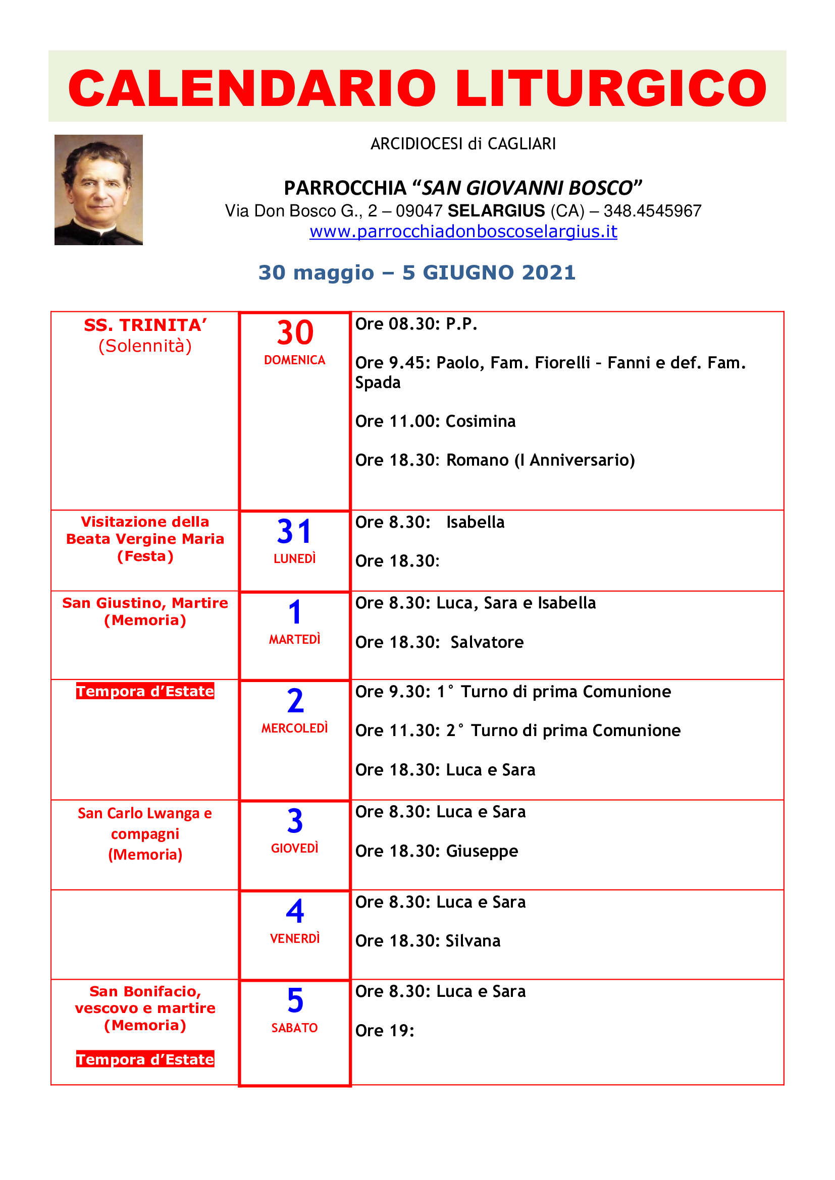 Calendario liturgico Solennità della Santissima Trinità Pubblicato giorno 30 maggio 2021 - In home page