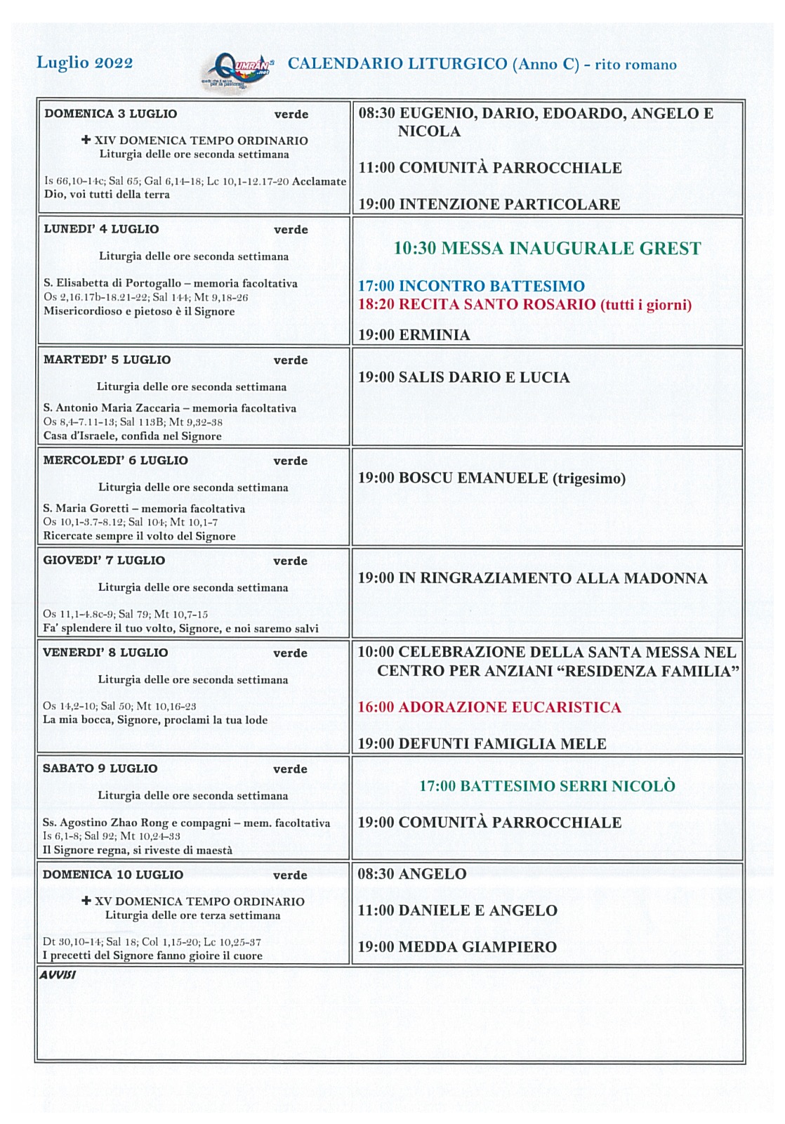 Calendario liturgico XIV domenica del T.O. Pubblicato giorno 4 luglio 2022 - Calendario liturgico, In home page