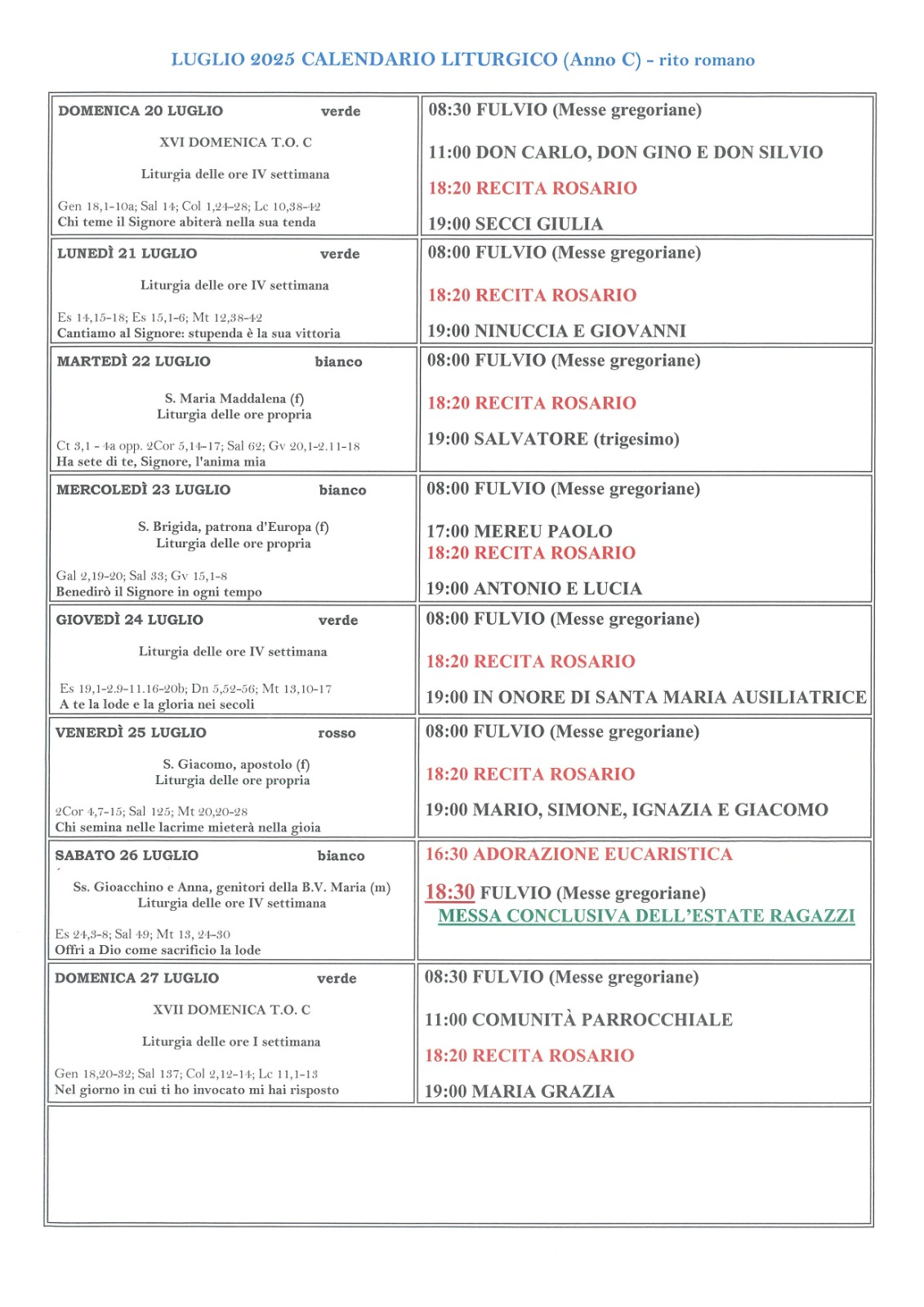 Calendario liturgico XVI settimana del T.O. Pubblicato giorno 18 luglio 2025 - Calendario liturgico, In home page