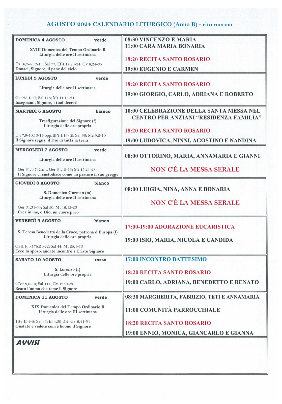 Calendario liturgico XVIII Domenica del T.O. Pubblicato giorno 8 agosto 2024 - Calendario liturgico, In home page