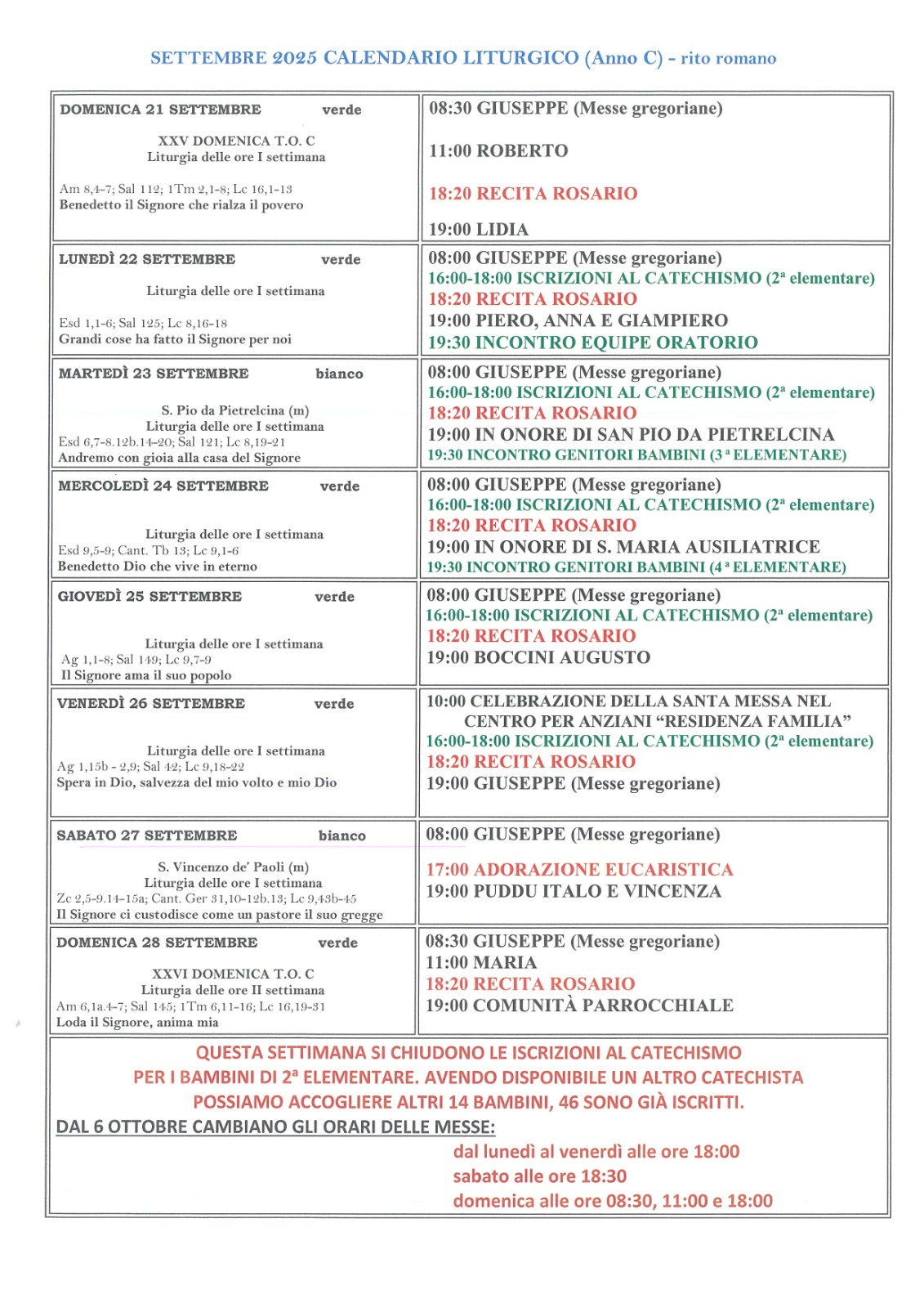 Calendario liturgico XXV domenica T.O. Pubblicato giorno 22 settembre 2025 - Calendario liturgico, In home page
