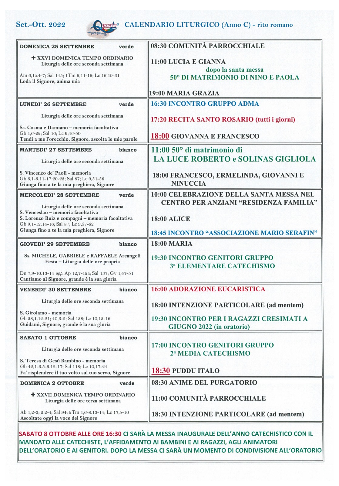 Calendario liturgico XXVI domenica del T.O. Pubblicato giorno 24 settembre 2022 - Calendario liturgico, In home page