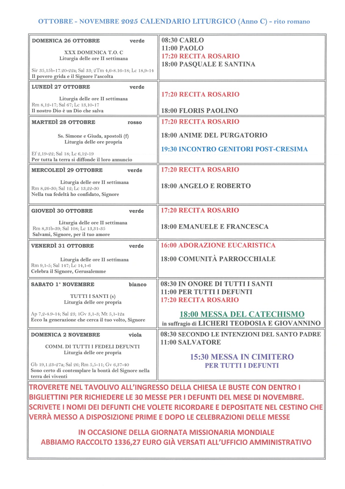 Calendario liturgico XXX domenica T.O. Pubblicato giorno 30 ottobre 2025 - Calendario liturgico, In home page