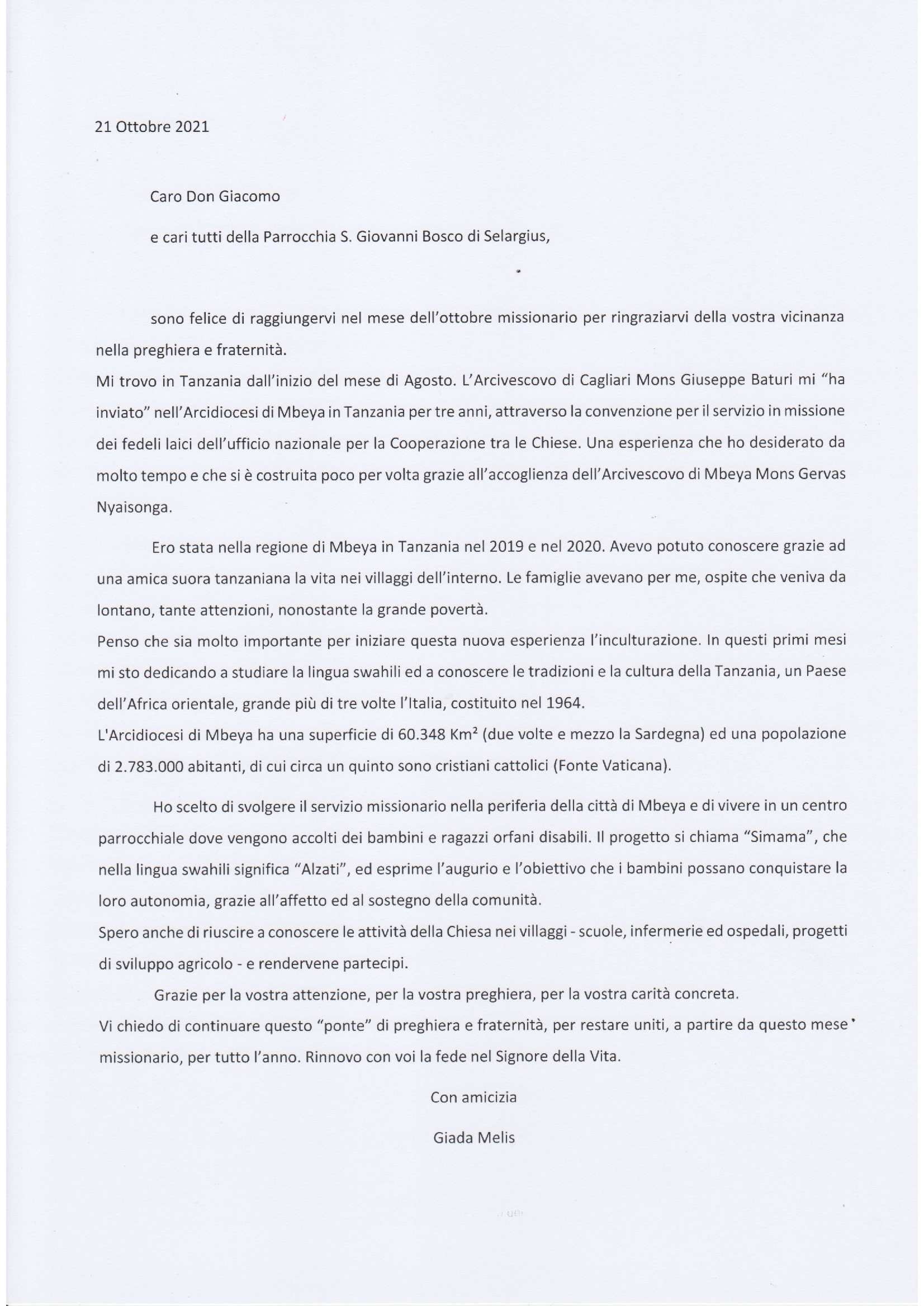 Lettera alla parrocchia di Giada Melis, Missionaria sarda in Tanzania Pubblicato giorno 23 ottobre 2021 - In home page