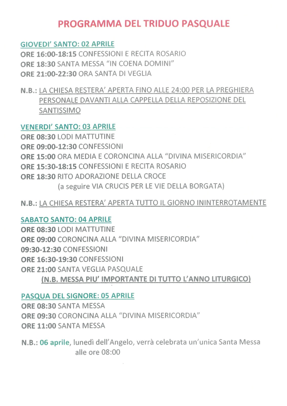 Programma del Triduo Pasquale
